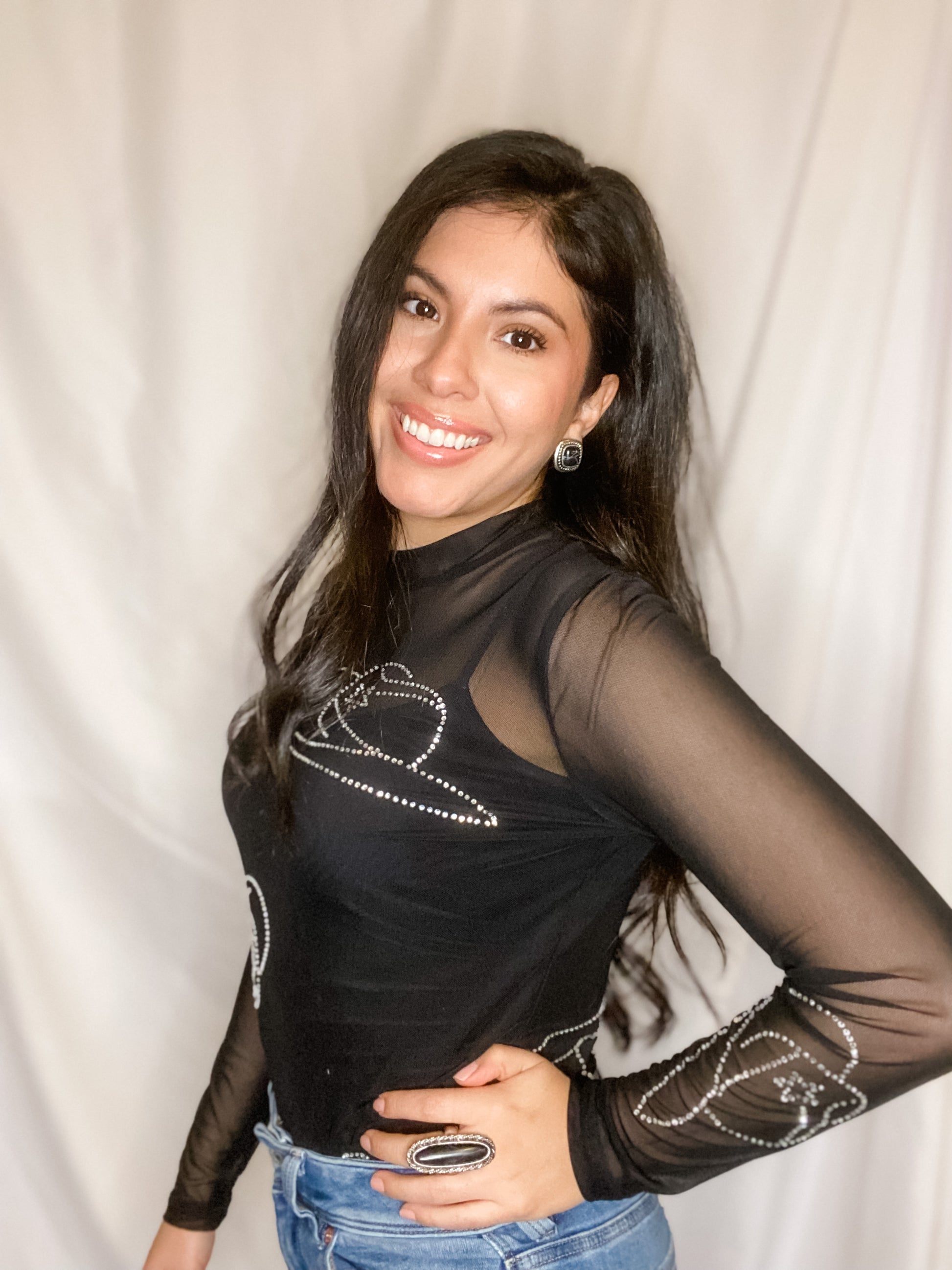 Stand out in this fitted, yet stretchy, long sleeve mesh top.